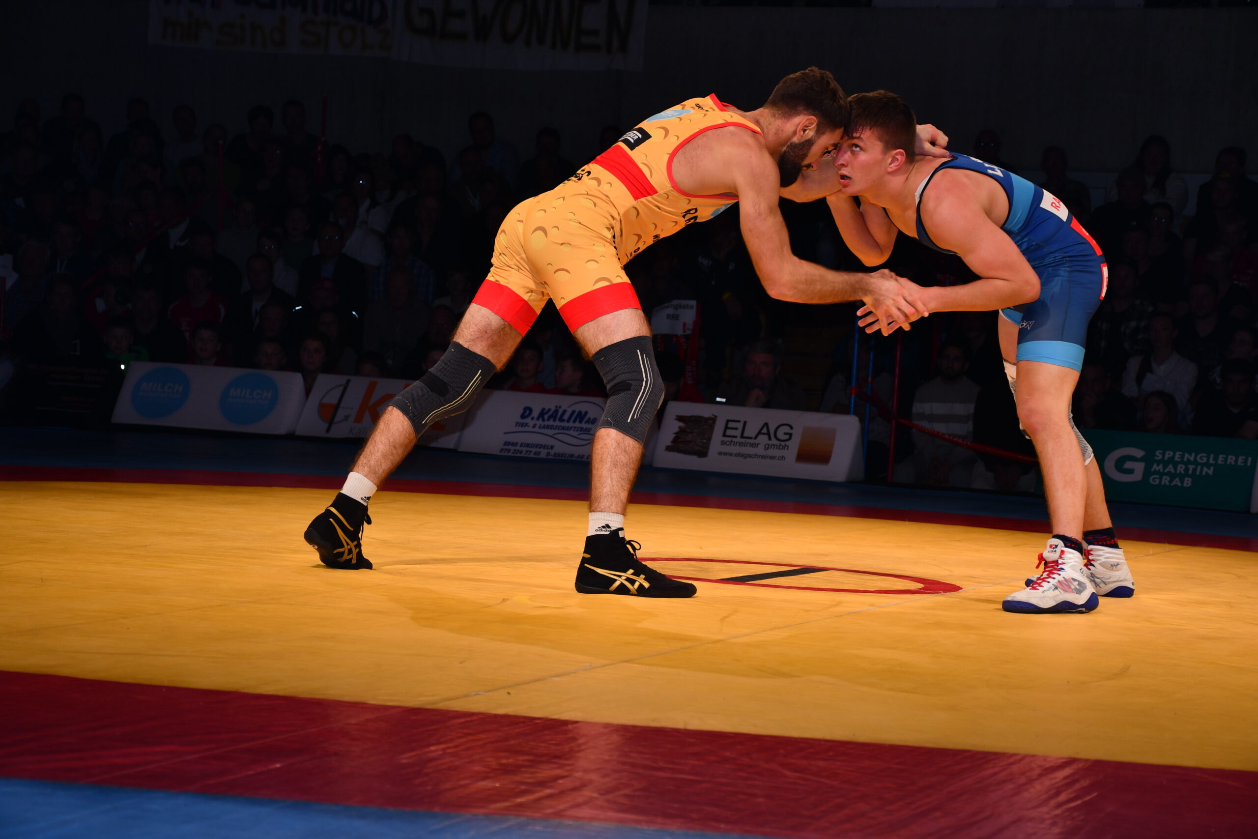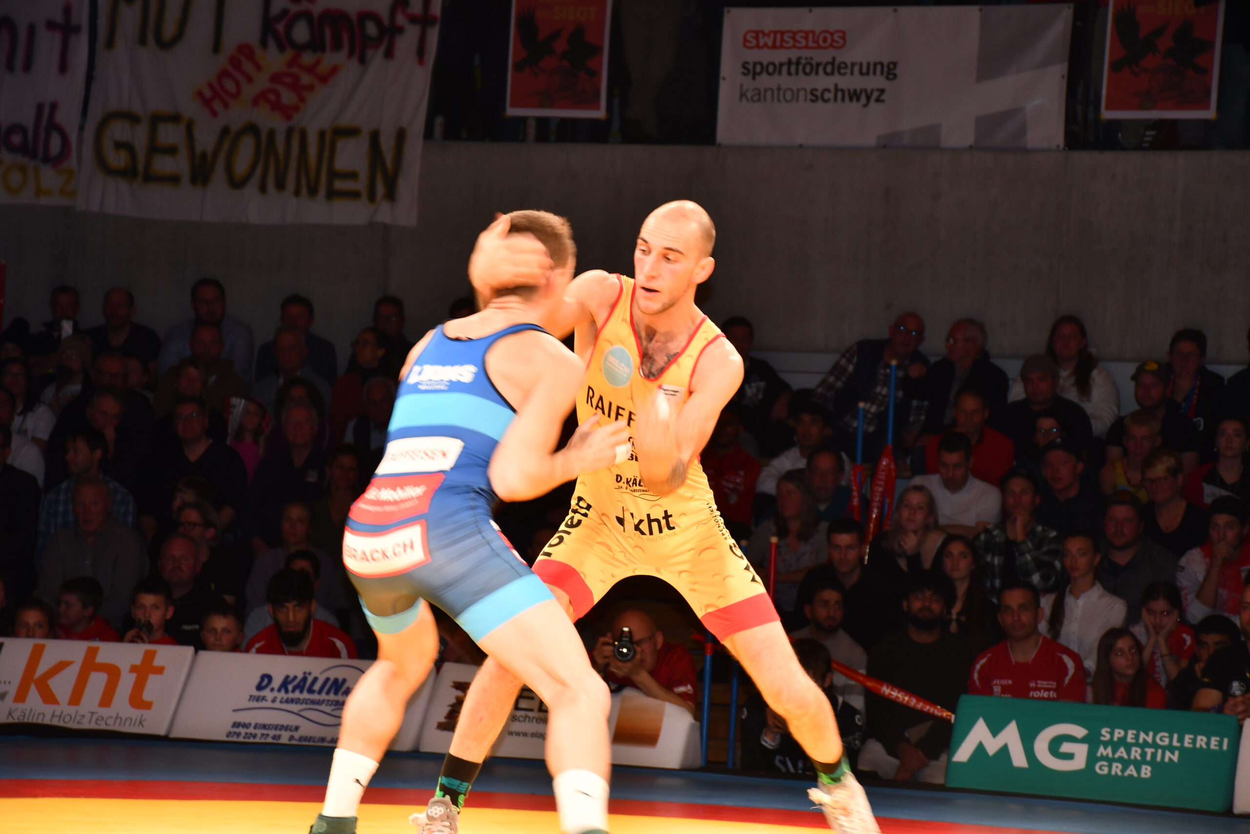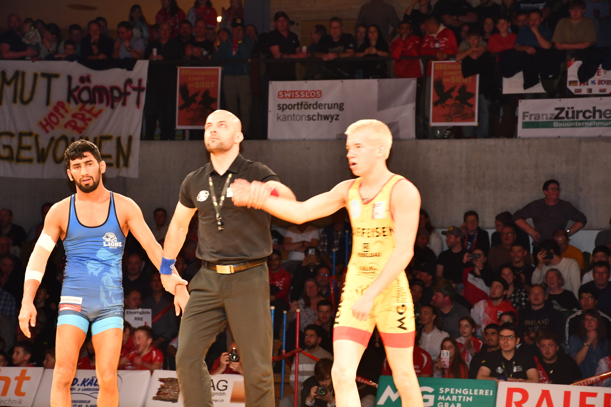 Zu Beginn liess Stone Perlungher seine Muskeln spielen und zeigte sich in glänzender Kampflaune. Er zog zum Auftakt gegen Haskid Abdul sämtliche Register seines Könnens. Mit seinen unablässig vorgetragenen Angriffen zermürbte er seinen Gegner und kam er noch vor Ablauf der Zeit bei einer 13:1-Führung zu einem Schultersieg. Für seinen starken Auftritt wurde er später zum «Fighter des Abends» auserkoren. Diesen Elan vermochte Sve Neyer wegen einer leicht lädierten Schulter im Schwergewicht gegen Delian Alishahi nicht mitzunehmen. Er geriet in der ersten Runde 3:0 in Rückstand, musste darauf weitere Punkte abgeben und verlor mit 6:0. Dann sorgte Jan Neyer für eine Überraschung. In einem über weite Strecken ausgeglichenen Duell kam er gegen Timon Zeder immer besser zurecht und lag bei Halbzeit mit 4:1 in Front.  Doch konnte der Gastringer zum 4:4 ausgleichen. In der letzten Sekunde holte Neyer noch eine Zweierwertung zum 6:4-Sieg.  Teamsenior Andrii Vyshar hatte gegen den Internationalen Samuel Scherrer wie erwartet einen schweren Stand. Der Willisauer diktierte das Geschehen und setzte ständig Nadelstiche. Er gewann vorzeitig durch technische Überlegenheit (15:0). Als dann Lars Neyer den favorisierten Ukrainer Illia Terzi von Beginn weg unter Druck setzte und ein wahres Feuerwerk von Griffen abbrannte, tobte der einheimische Anhang und trieb ihn zum 11:5-Sieg. Damit stand es bei Halbzeit 9:9 unentschieden.