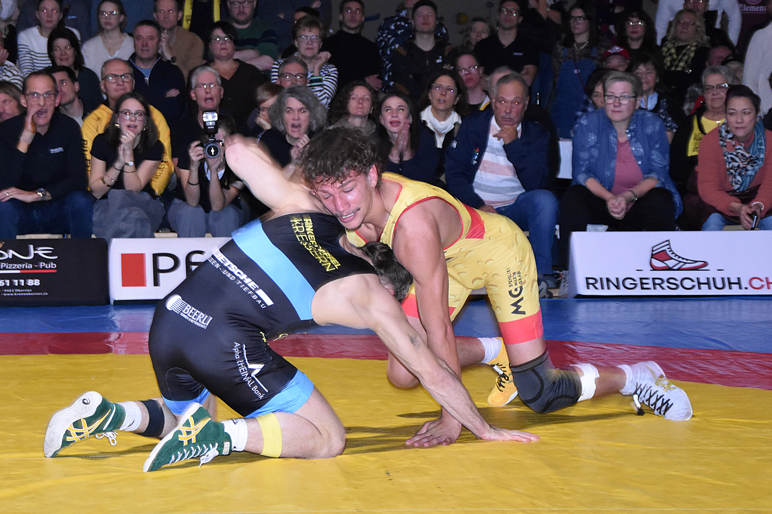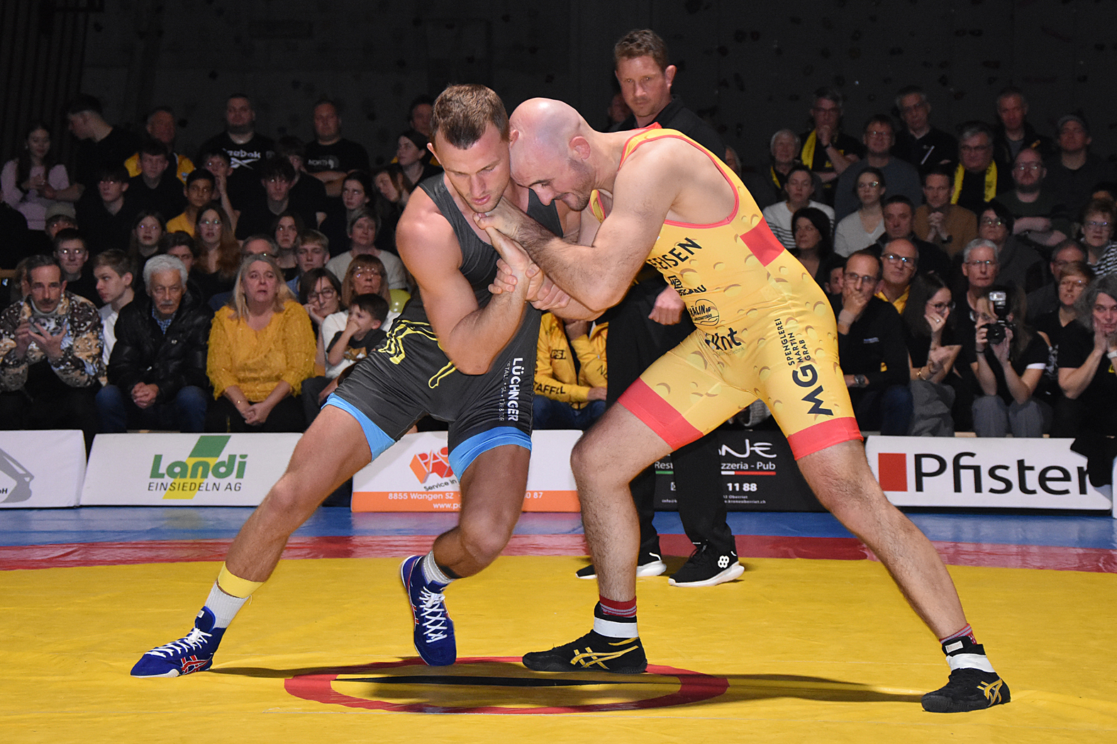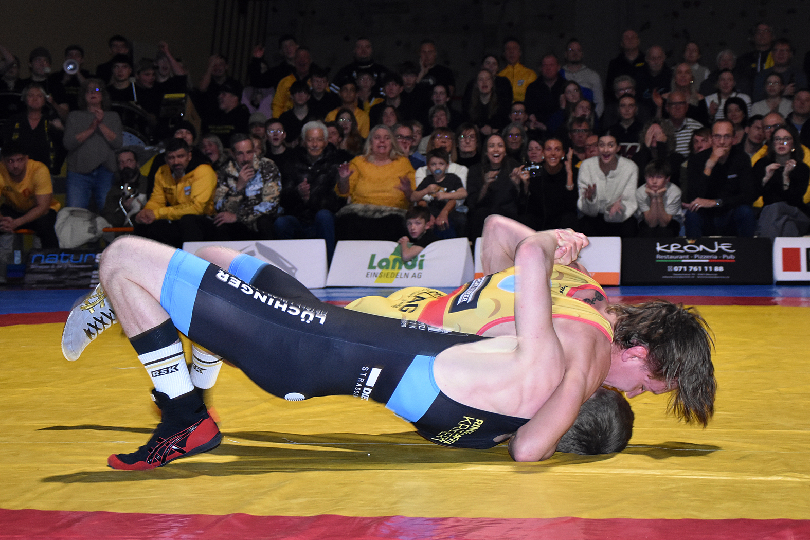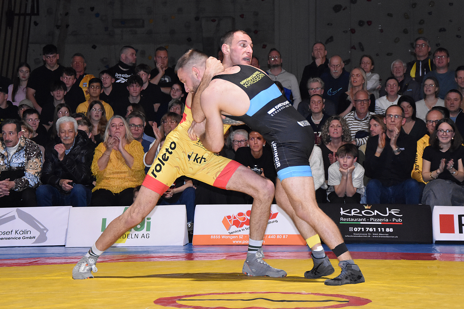 Die Kämpfe hatten viel Spannung zu bieten. Zum Auftakt hätte man erwartet, dass Freistiler Stone Perlungher gegen den Greco-Spezialisten Levin Meier einen schweren Stand haben dürfte. Doch er stellte sich ausgezeichnet auf seinen Kontrahenten ein, ging sogar in Führung und verlor nach turbulenten Szenen erst in der Schlussphase mit 10:9, holte aber einen wertvollen Mannschaftspunkt. Sven Neyer ging gegen den ungemein gefährlichen Damian Dietsche auf die Matte. Er wurde gleich zu Beginn mit einem Armzug (4:0) erwischt und musste gegen den unberechenbaren Rheintaler höllisch auf der Hut sein. Es gelang ihm, den Rückstand mit kleinen Wertungen wettzumachen und sich letztlich hauchdünn mit 7:6 durchzusetzen. River Perlungher traf bis 61 kg, Freistil, auf Dominik Lartiz, der auch im Mixed Martial Arts (MMA) erfolgreich unterwegs ist. Der Gastringer setzte bald einmal die Akzente, kam mit guten Griffkombinationen immer wieder durch und führte bei Halbzeit mit 4:0. Perlungher musste auch danach unten durch, konnte aber bei der 14:0-Niederlage die Höchststrafe gerade noch vermeiden. Damian von Euw und Ramon Betschart lieferten sich einmal mehr ein Duell auf Augenhöhe. Nach der ersten Runde lag von Euw mit 1:0 im Hintertreffen, doch konnte er ausgleichen und mit 4:1 gewinnen. Jan Neyer wehrte sich gegen das bulgarische Greco-Ass Dimitar Sandov mit allen Mitteln, es gelang ihm die Niederlage mit 12:0 in Grenzen halten. Damit lag Einsiedeln zur Pause 5:10 zurück, was sich für den weiteren Verlauf als schwere Hypothek erwies. Wohl nur noch die kühnsten Optimisten rechneten mit einem Sieg.