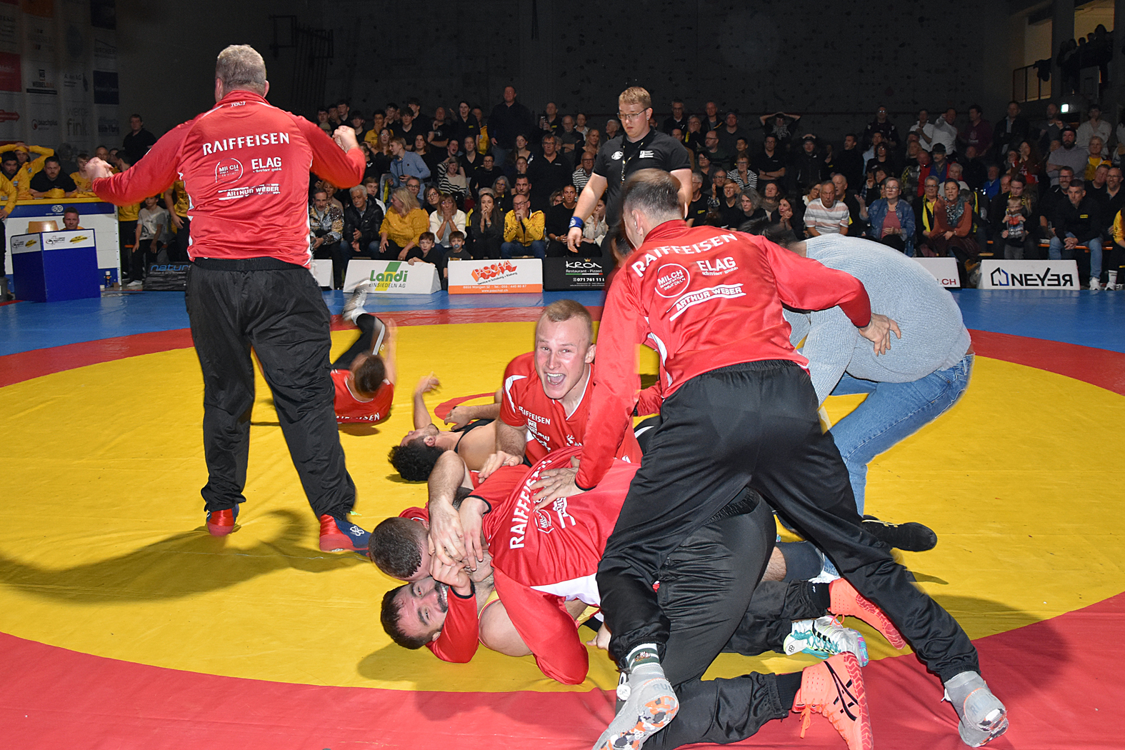 Welche Kräfte die Einsiedler nicht zuletzt dank der Unterstützung des Heimpublikums freizusetzen vermochten, zeigte Andreas Burkard gegen Robin Zwick. In einem von der Taktik geprägten Duell ging er vorsichtig ans Werk und führte nach drei Minuten mit 1:0. Sein Kontrahent bot ihm kräftig Stirn, doch wusste er die Konterversuche im Keime zu ersticken. Bei seinem 5:0-Sieg liess er seinem gefährlichen Gegner keine Wertung zu. Das Aufeinandertreffen zwischen den beiden Freistilern Kay Neyer und Sandro Hungerbühler bis 70 Kilogramm verlief über weite Strecken spannend. Neyer kämpfte konzentriert, konterte in der zweiten Hälfte mit wirkungsvollen Beinangriffen geschickt und blieb mit 10:3 siegreich. Dank dieses Erfolges gab es drei wichtige Zähler zum Gleichstand von 11:11. Doch deswegen war noch lange nichts unter Dach und Fach. Ganz im Gegenteil: Das Kribbeln blieb aufrecht. Der Freiburger Matthias Käser in Einsiedler Diensten traf auf den ukrainischen Klasseringer Artemi Utochkin. Er gab alles, liess sich aber durch einen Hüfter erwischen. Beim Stand von 11:15 war vor den beiden letzten Kämpfen Hochspannung angesagt. Jan Walker und Dorien Hutter, die sich in dieser Saison zwei enge Duelle lieferten, waren einer grossen Belastung ausgesetzt. Vor einer Woche musste Walker eine knappe 5:3-Niederlage hinnehmen. Diesmal schlug das Pendel auf seine Seite. Er kämpfte hochkonzentriet, ging in diesem verbissen geführten Duell mit 1:0 in Führung, die er nicht mehr preisgab und mit 3:1 als Sieger ausgerufen wurde. Das war eine schöne Revanche zum exakt richtigen Zeitpunkt. Beim letzten Duell zwischen Pavel Untila und Michel Steger mussten beim Stande von 13:16 die Würfel fallen. Rein rechnerisch konnten Einsiedeln Kriessern noch überholen, doch dafür musste das Punktemaximum her, während Kriessern nur noch einen Zähler für die Krönung brauchte. Eine äusserst delikate Aufgabe für beide Seiten. Der Einsiedler gab den Ton an und sammelte gegen seinen defensiv ausgezeichnet agierenden Gegner mit seiner Beinarbeit fleissig Punkte. 27 Sekunden vor Schluss holte er mit einer Zweierwertung das 15:0 und damit den 17:16-Sieg für Einsiedeln. «Obschon mir bewusst war, dass ich vier Mannschaftspunkte holen musste, versuchte ich alles auszublenden, viele Gedanken machte ich mir nicht mehr und gab einfach alles», sagte der Matchwinner. Beim Gesamtstand von 33:33 hatte Einsiedeln mit elf Einzelsiegen gegenüber Kriessern mit neun den Finaleinzug geschafft. Das sorgte für Schreie aus den fast 700 Kehlen. Die meisten aus Freude. Aber manche auch nicht. Wer Kriessern im Herzen trug, der brüllte aus Schmerz. Anschliessend lagen sich die Einsiedeln Ringer und das Betreuerteam in den Armen und liessen sich von den Fans feiern. Mit dem Erreichen des Finals haben sie einen Meilenstein geschafft. Das letzte Ringer-Finale verlor Einsiedeln 1989 gegen Kriessern mit lediglich einem Punkt Unterschied. Vier Jahre früher holte Einsiedeln die Silbermedaille, doch stand Kriessern frühzeitig als Meister fest.